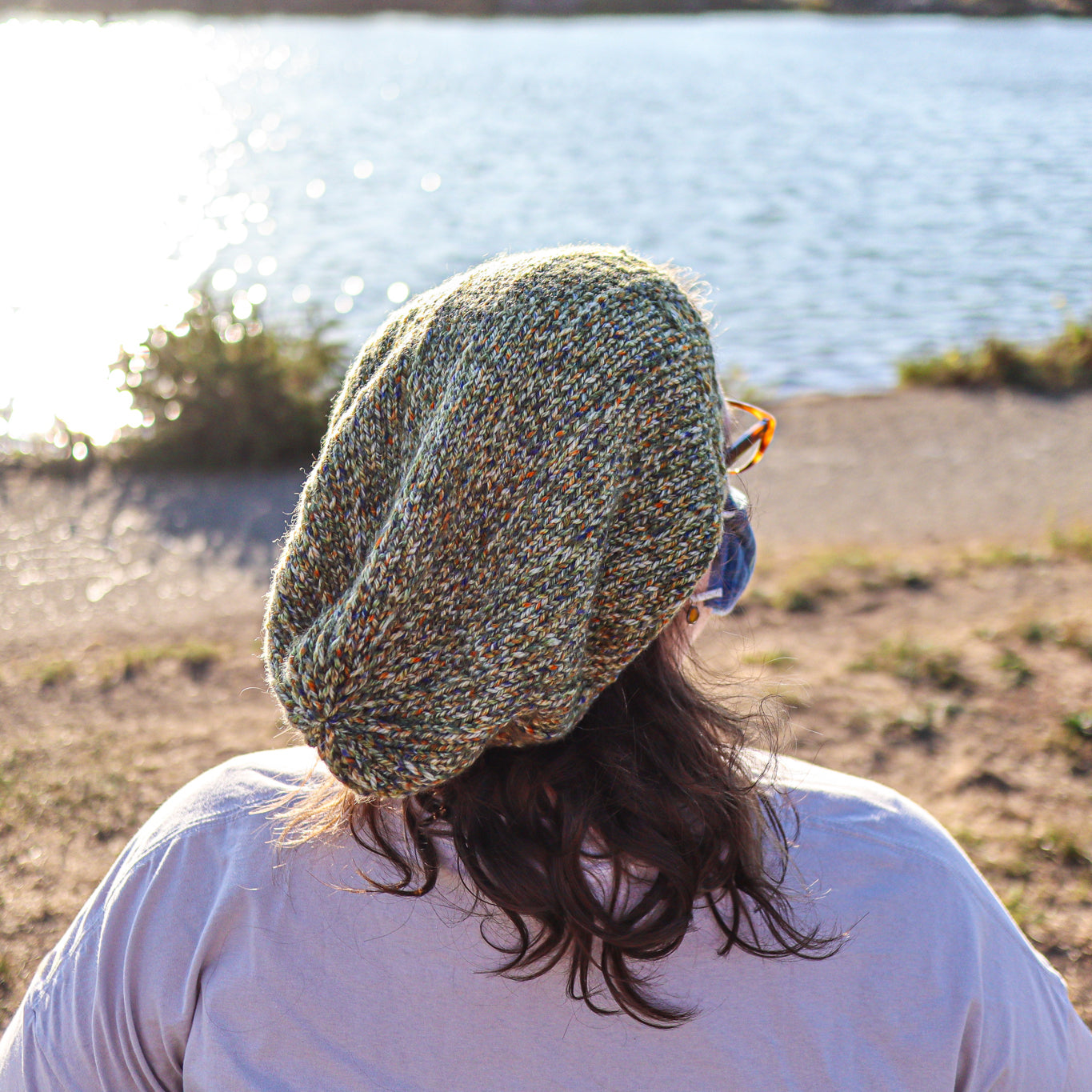 Maia Discoe designed this easy yet satisfying hat for any Aran weight yarn. Township is a simple slouchy hat with an understated pattern. It is worked from the bottom up using a lovely slipped stitch ribbing that I have loved for years. The ribbing transitions into stockinette with the slipped stitch maintained for a subtle and simple texture. A perfect quick, one skein project for a beginning or advanced knitter. The hat has a loose fit. If you like a snugger fit, go down a size. It can be made as a beanie or slouchy as shown.