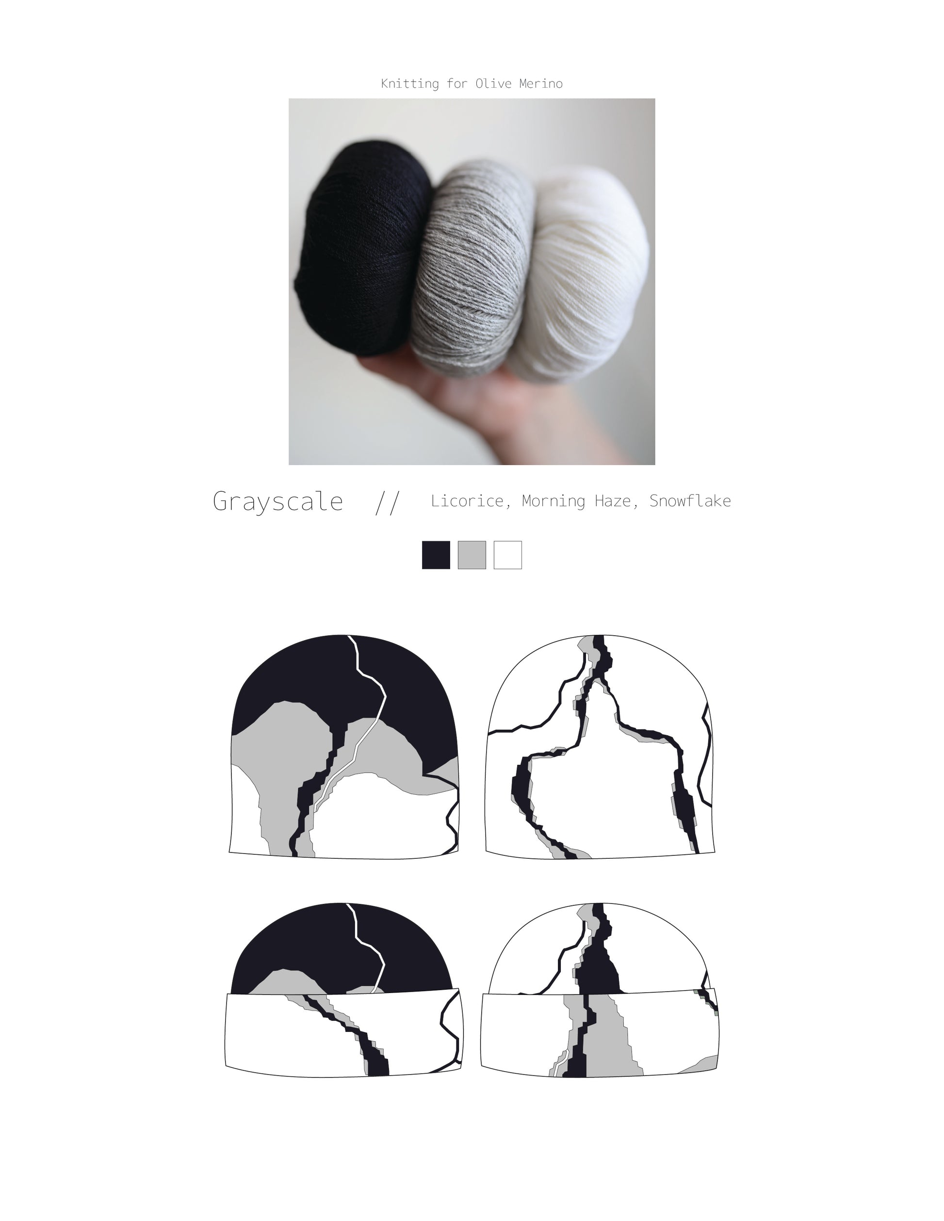 Grayscale: Knitting for Olive Cotton Merino in Licorice, Morning Haze, and Snowflake